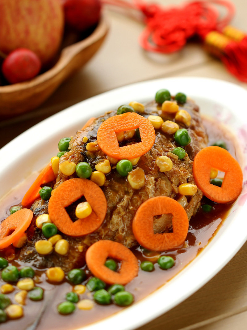 16:最后再在鱼的表面上随意摆放些红萝卜做出的金钱来装饰。