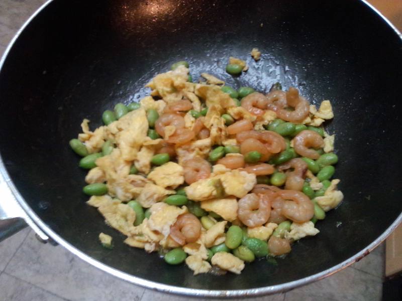 4:虾仁差不多炒熟时倒入鸡蛋,继续翻炒,加入适量盐和鸡精,一盆香喷喷的虾仁鸡蛋毛豆就炒好啦。