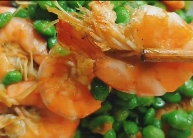 6:毛豆炒至变色,加入河虾后加盖几秒再炒匀,要不虾子会跳出来哈。
