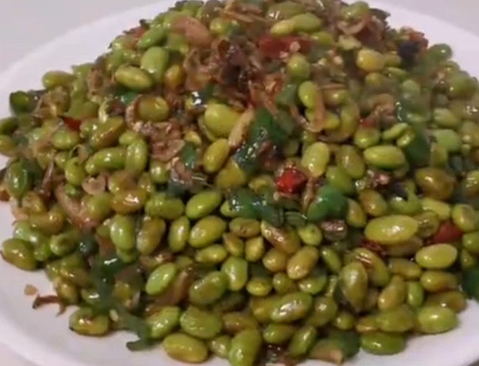 6:接着,合入已焯熟的毛豆翻炒一下。