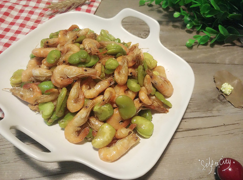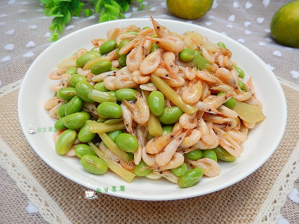 3:重新起锅下油,葱白爆香后,先后倒入毛豆和虾仁翻炒。