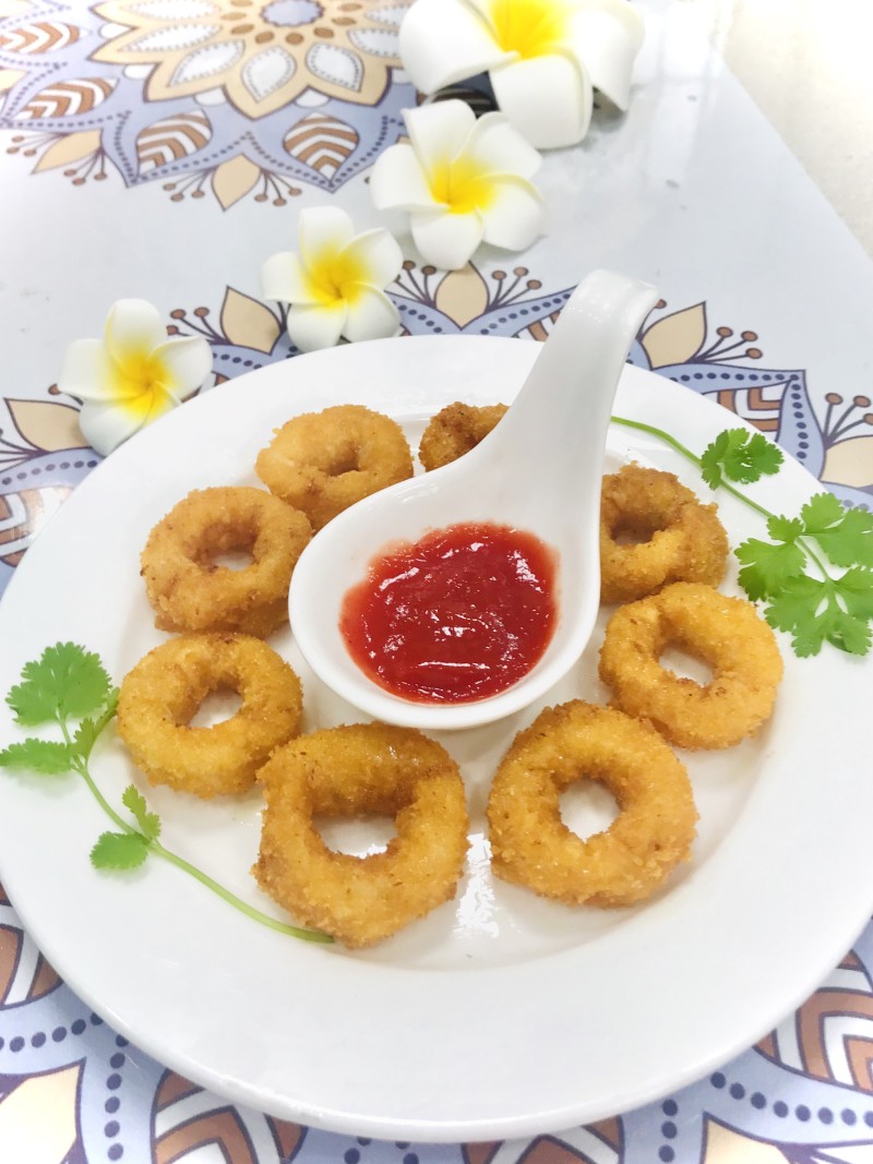 鱿鱼圈切稍微厚一点,炸了肉质会收缩。