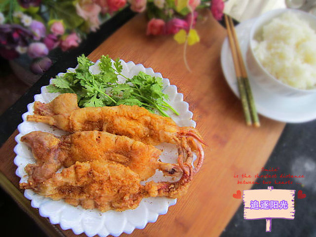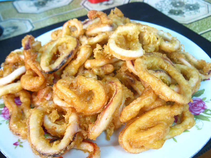 如果掌握不好火候,可以先放进一根裹好的鱿鱼试一试温度。放入锅中的鱿鱼马上浮起说明油温已经到180℃,可以进行炸制。