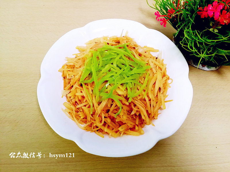 4:炒锅放油,大火加热,油温八成热时把青椒丝过油立即捞起,再把土豆丝放入快速翻炒几下,迅速放白醋翻炒