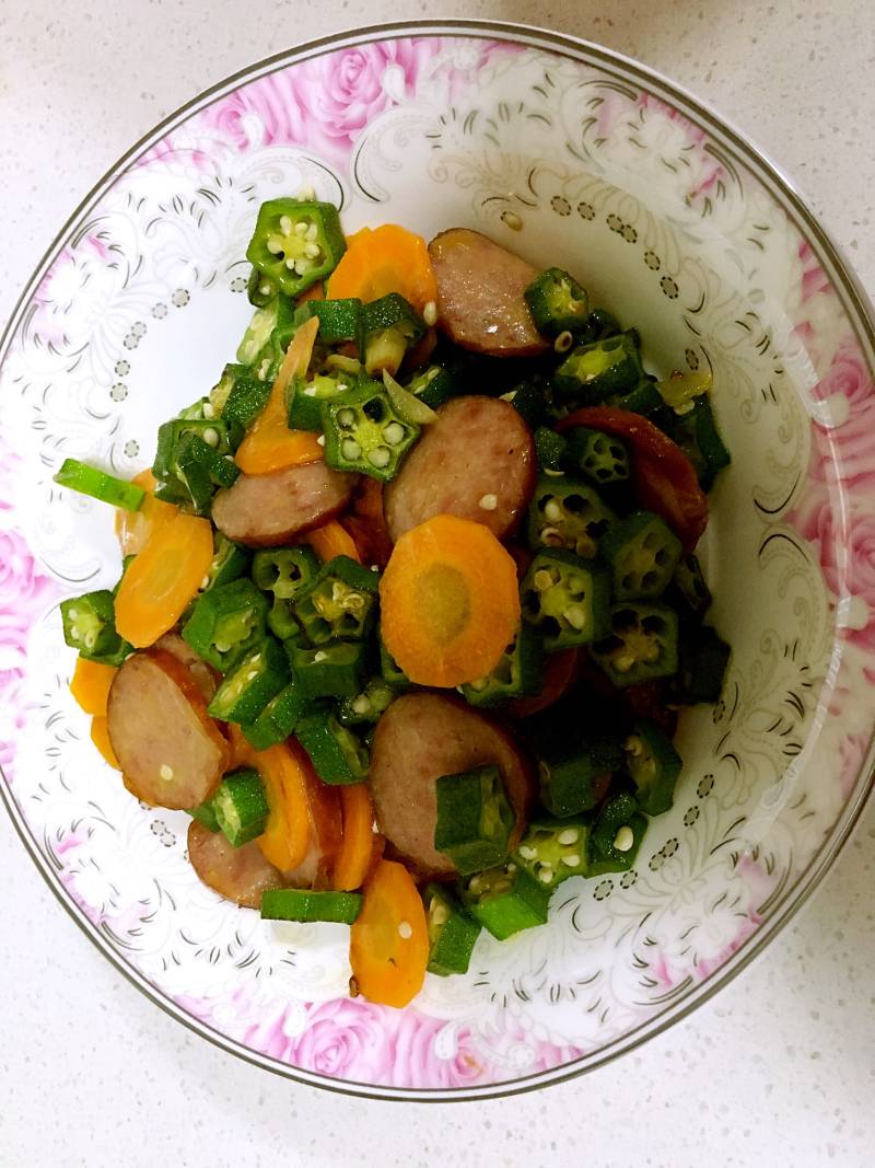 秋葵300g;香肠1根;蒜适量;胡萝卜适量;