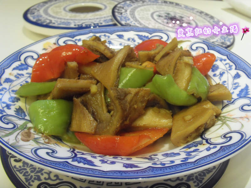 7:然后,合入熟牛肚翻炒一下。