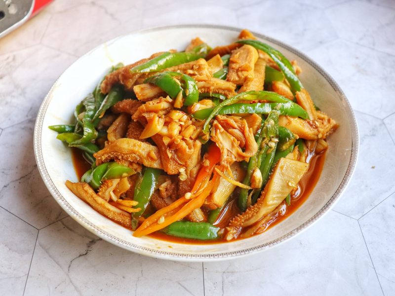 7:炒至青椒断生后,倒入牛肚丝继续翻炒;