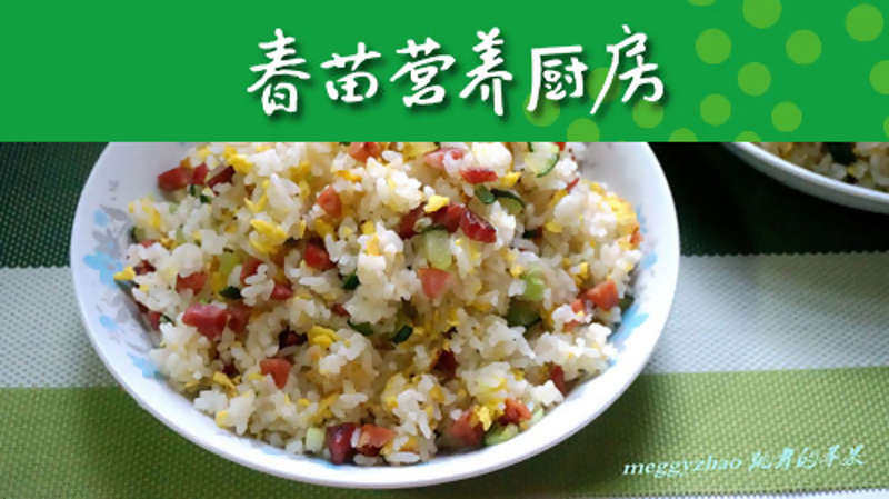 胡萝卜20g;火腿20g;豌豆20g;黄瓜20g;鸡蛋1个;米饭200g;