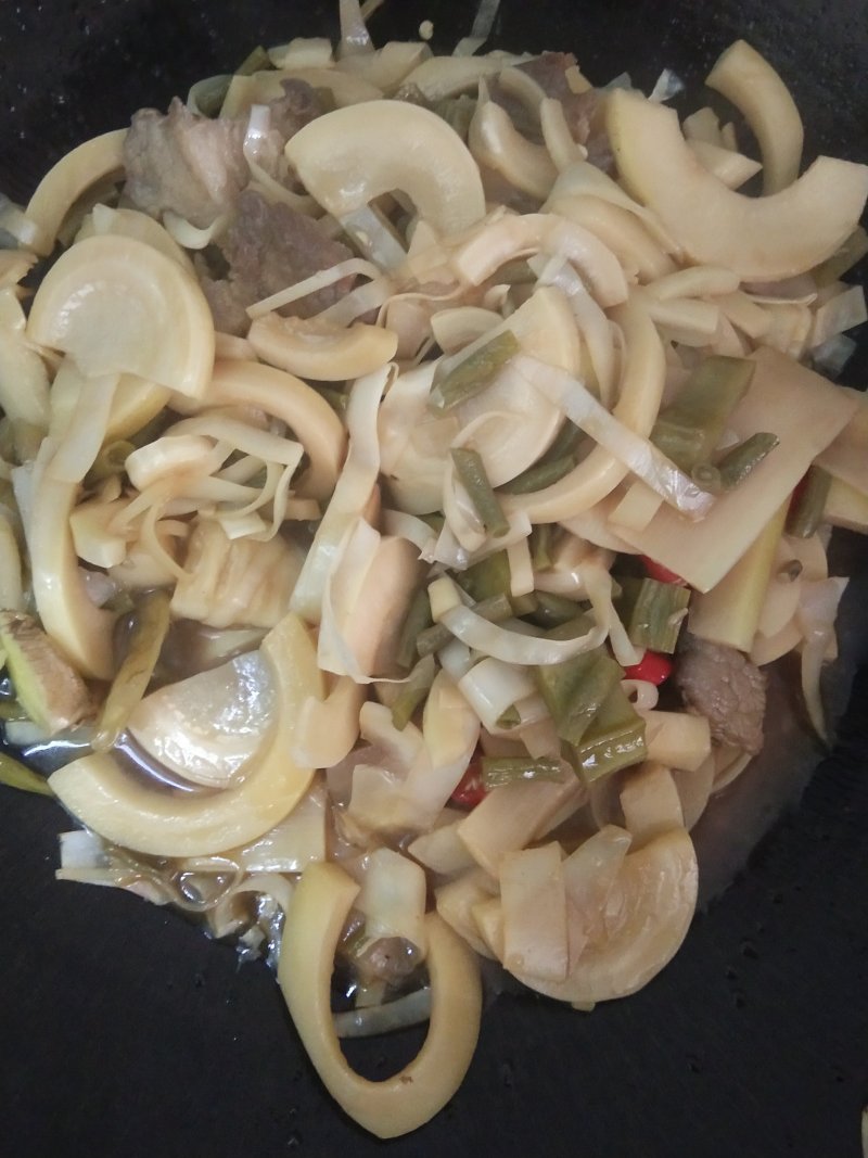 3:猪肉酸豆角炒香后加入酸笋一起焖炒。