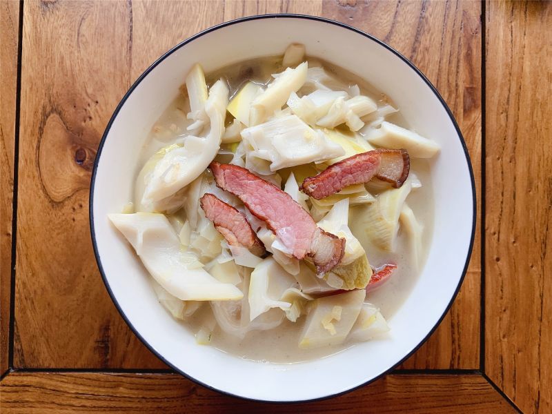 7:炖煮15分钟,汤色变白即可。通过温水浸泡控制笋的咸度,不许要额外调味,笋本身的咸鲜和腊肉的鲜味已经足够。