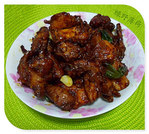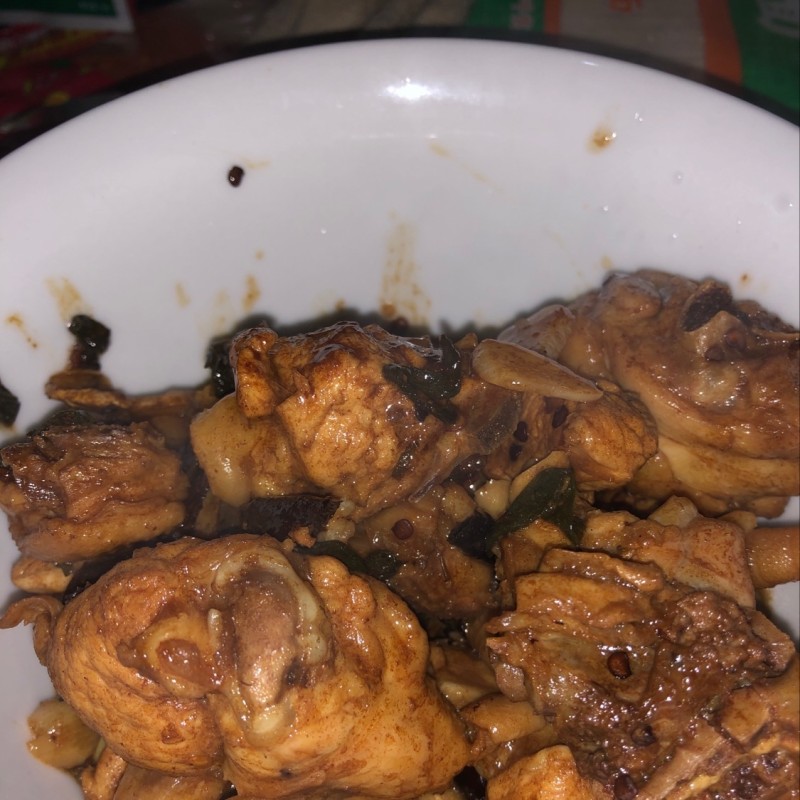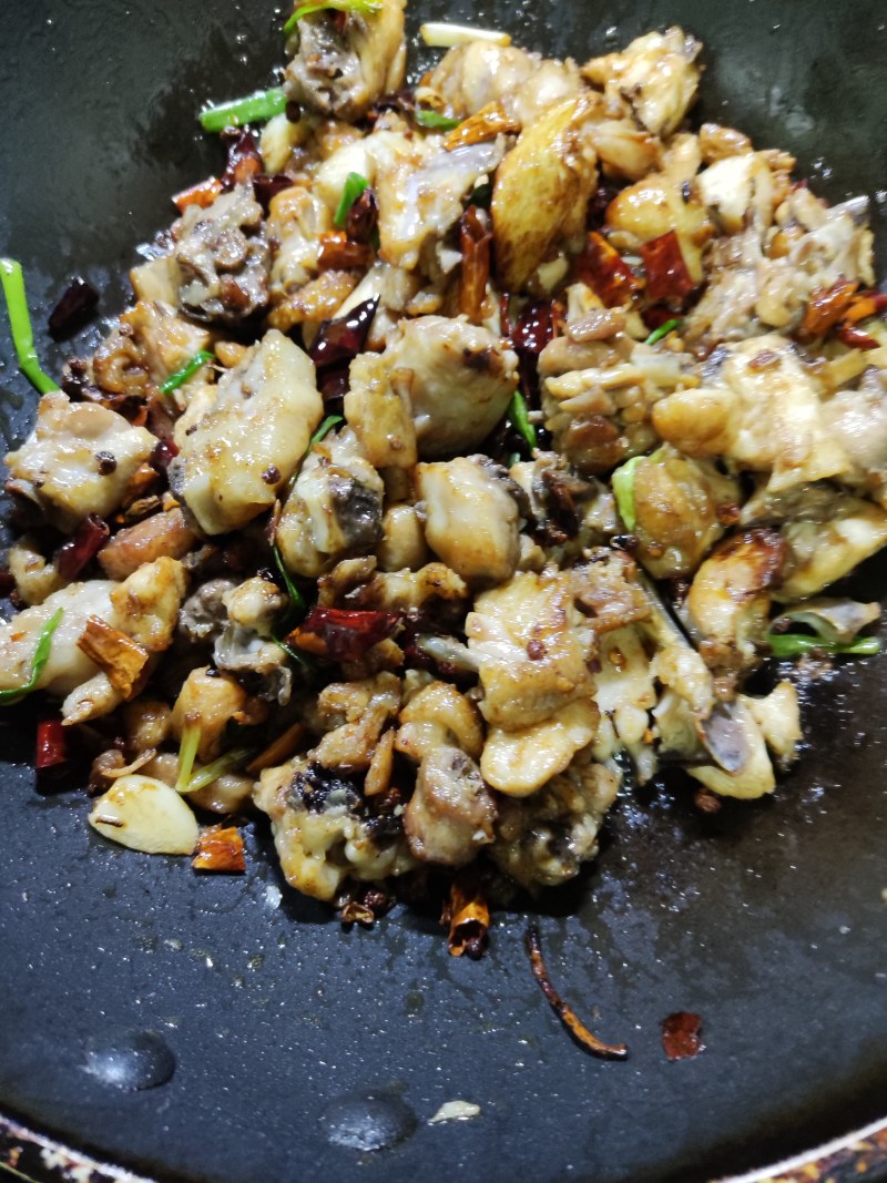 6:鸡块煸炒出水分,煸熟鸡块即可。