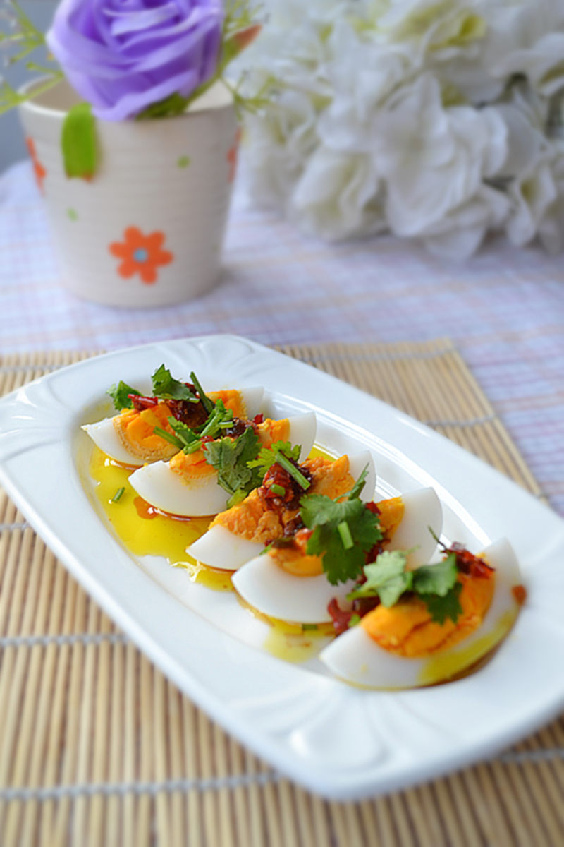 8:将锅内的酱汁浇到鸭蛋上,最后再撒上香菜末即可