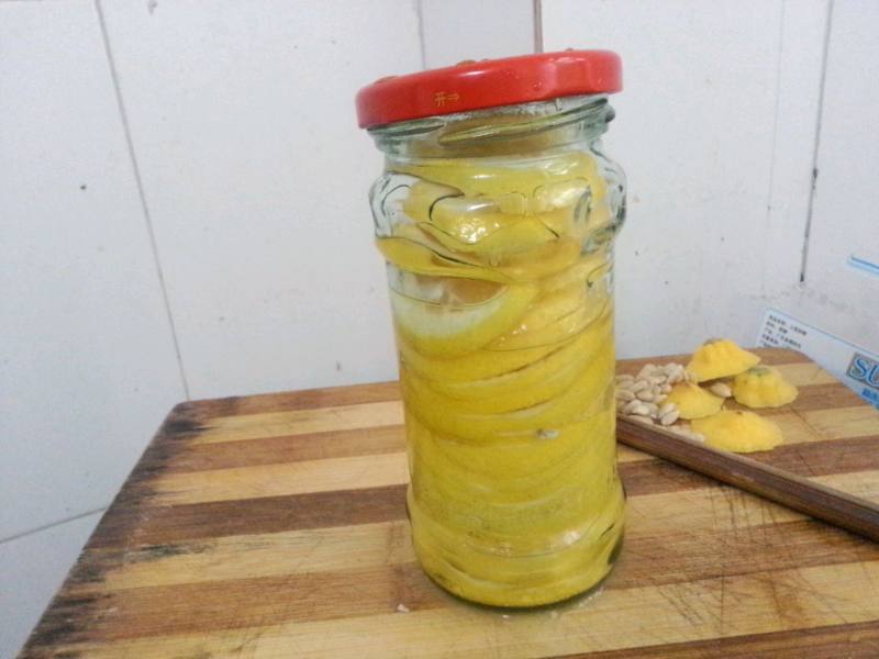 6:盖上盖子,一个星期左右就可以了,用的时候用无水无油的勺子取柠檬泡水,再取一勺蜜水(我急性子,三天我就开了)