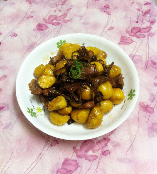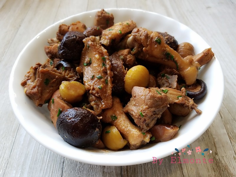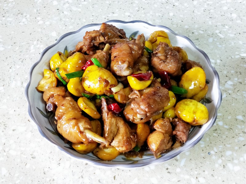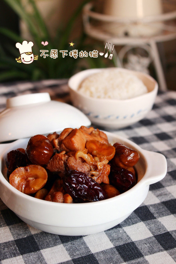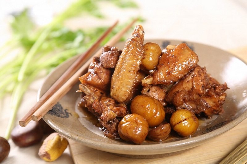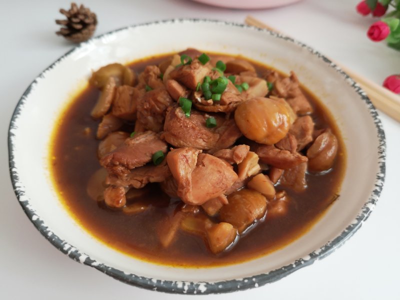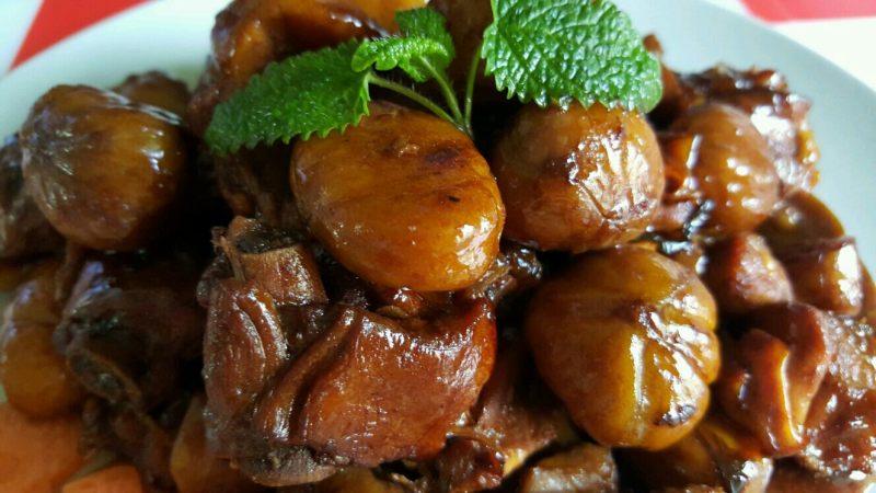 5:栗子烤熟后剥掉壳,放入鸡块中,继续焖煮半小时。