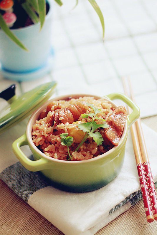 5:铺上浸泡过的大米和适量的清水,以没过大米为宜;按下煮饭键即可!煮好后根据个人口味用适量盐调味。拌匀后盛碗开动吧~~~