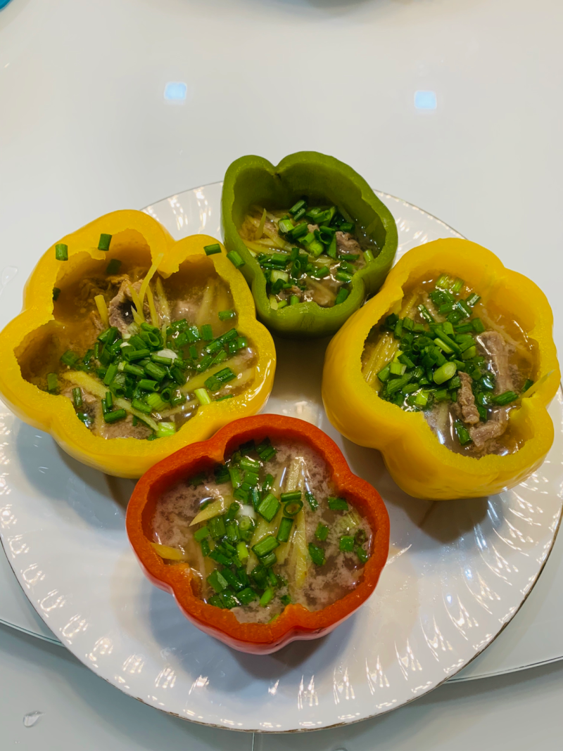牛肉适量;绿菜椒1个;黄菜椒1个;
