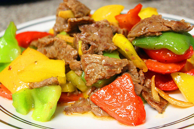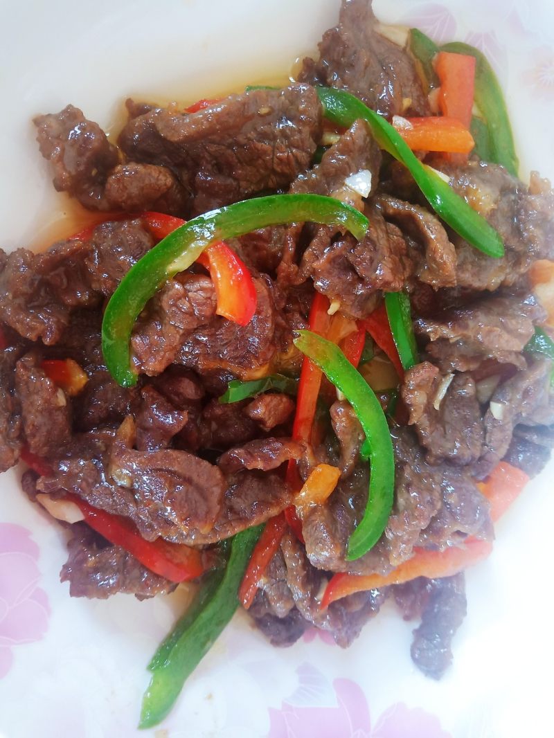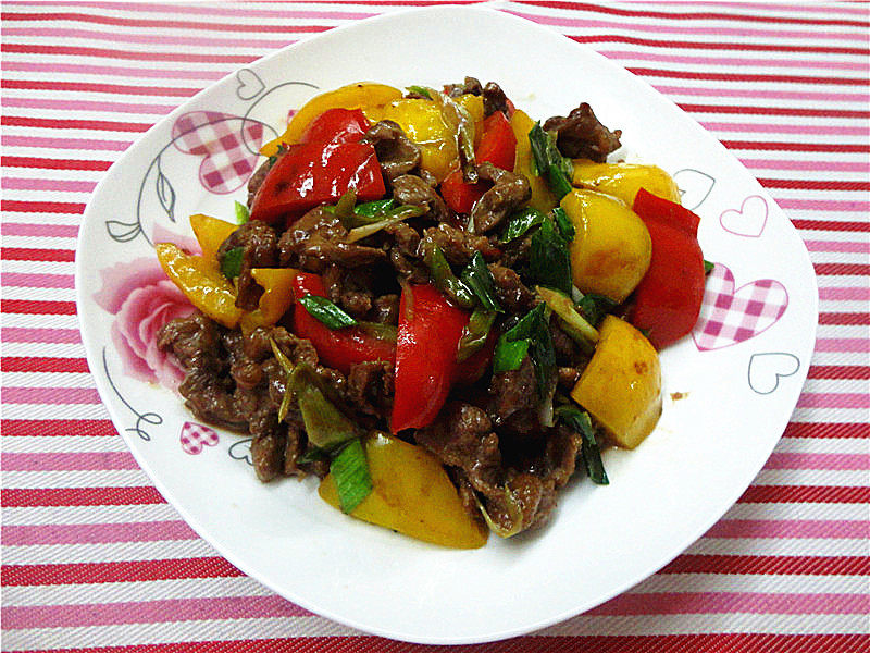 3:锅里倒油先把牛肉爆炒盛出来,在放油炒彩椒,加少许盐放黑胡椒粉,把前面炒好的牛肉丝放锅里一起炒,翻几下后就可以出锅了