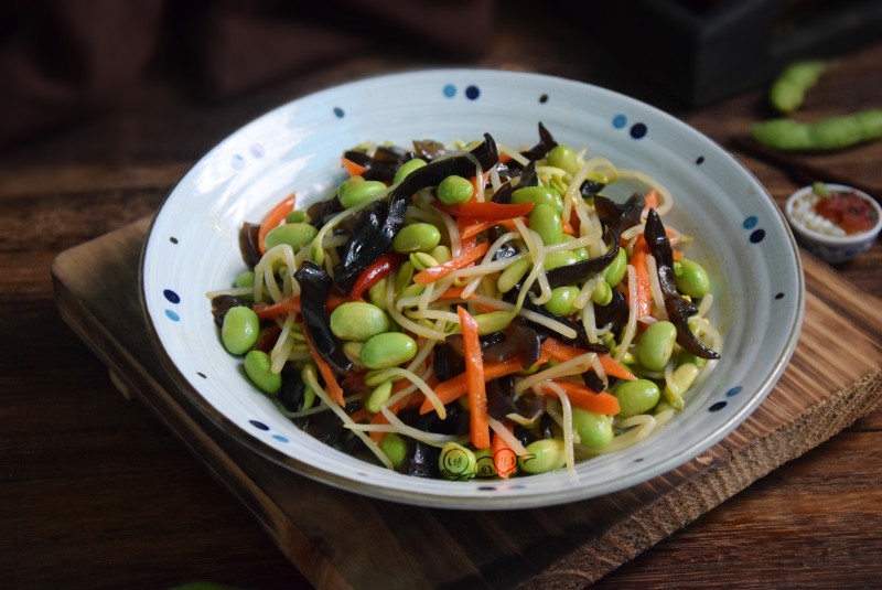 毛豆150克;木耳80克;豆芽150克;胡萝卜半根;