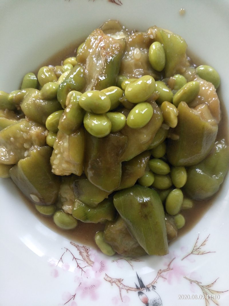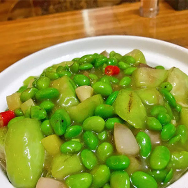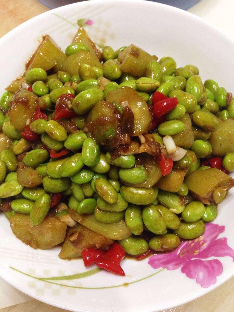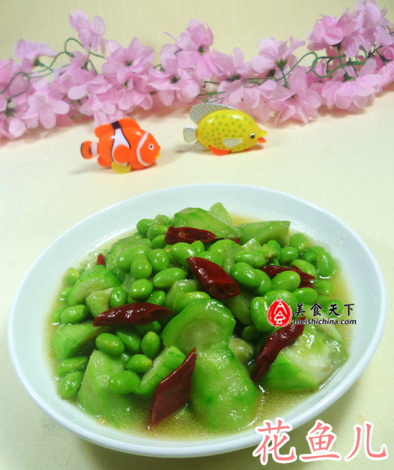 5:热锅冷油,爆香红椒,放入毛豆翻炒变皱,再加入丝瓜烧至断生;起锅前放酱瓜丁,加少许清水,少许盐。