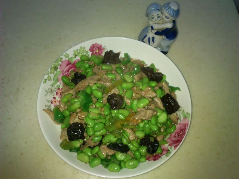 3:锅内留底油爆香葱姜丝,下毛豆、木耳。翻炒均匀。