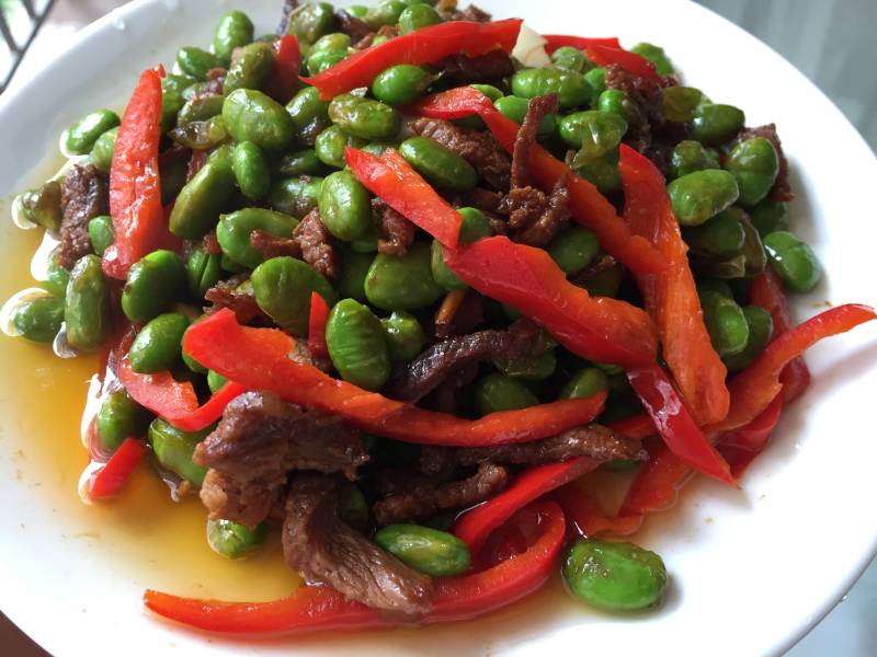 4:毛豆略有变色后下盐,翻炒均匀后倒入青椒和肉丝。翻炒,最后加味精出锅。
