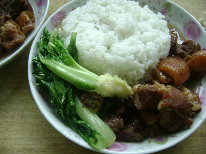 大葱适量;蒜适量;鸡精适量;盐适量;青菜适量;米饭适量;冰糖适量;茴香适量;八角适量;姜适量;醋适量;酱油适量;