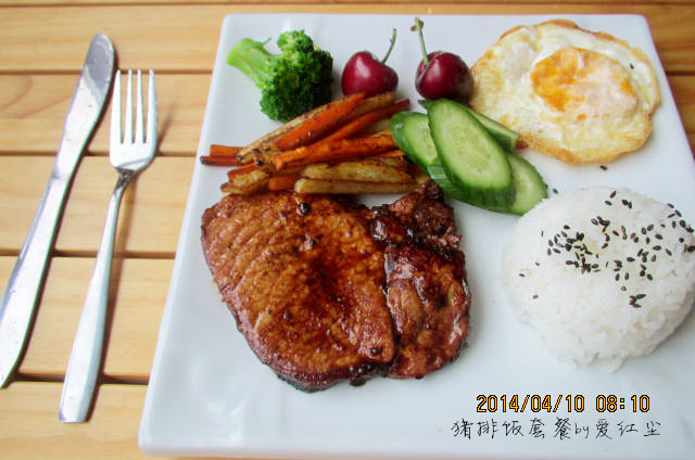 猪大排2块;鸡蛋2个;西兰花2朵;黄瓜适量;红罗卜适量;土豆适量;车李子适量;新鲜香米饭适量;黑芝麻适量;