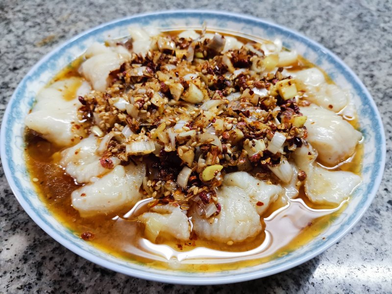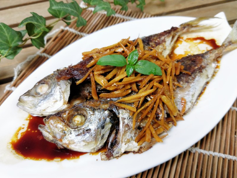 7:将炒好的姜油酱汁浇入鱼身表面,完成。