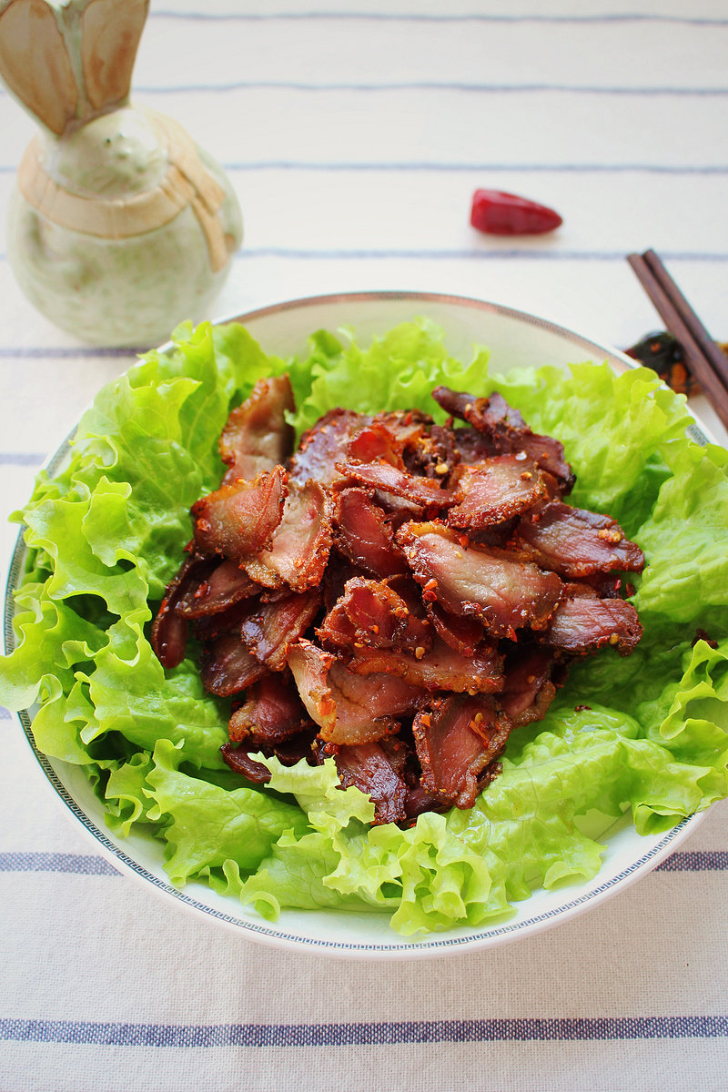7:盛出干巴放在生菜叶上,太好吃啦,还没开饭就已经下去好多了,当零食也是特别棒;