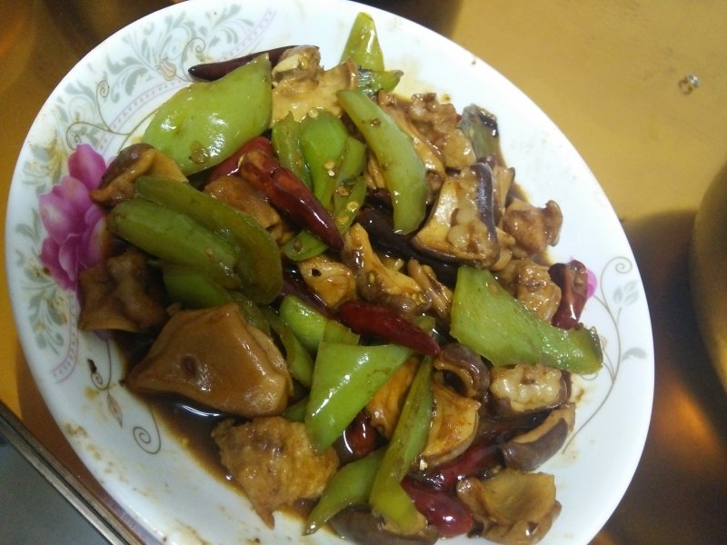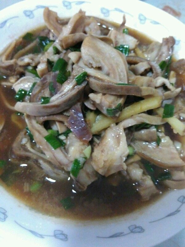 4:葱姜爆锅!猪肚下锅大伙翻炒!干辣椒少量!尖椒下锅盐十三香翻炒最后鸡精味精适量适量勾芡!!出锅来吃