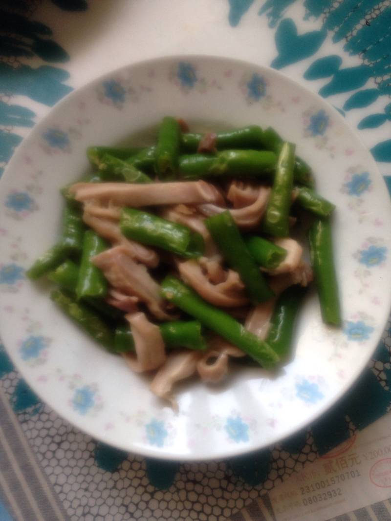 4:炒锅加油,先煸炒杭椒,等杭椒变色下猪肚一起翻炒几下,加盐和一汤匙水,见水快干了加鸡精,出锅菜成。