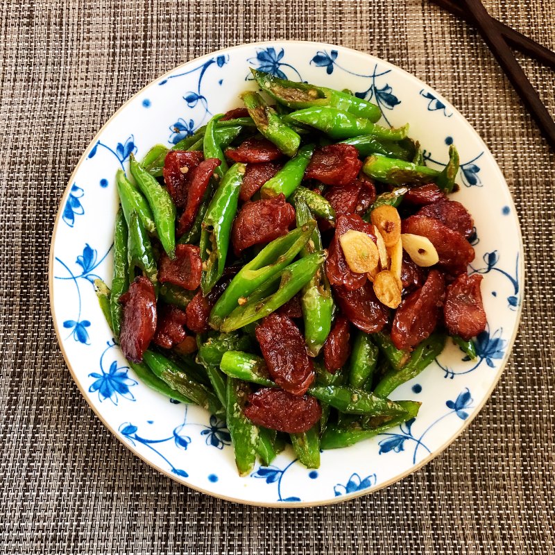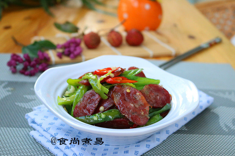 1:备好食材,杭椒、蒜瓣、小米椒、腊肠;