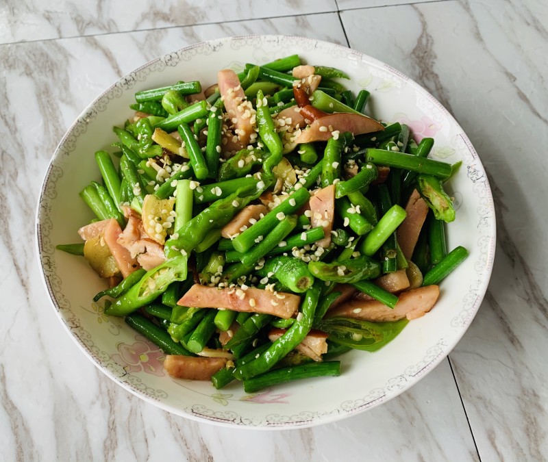 香肚1块;蒜苔7~8根;杭椒适量;火麻仁15克;