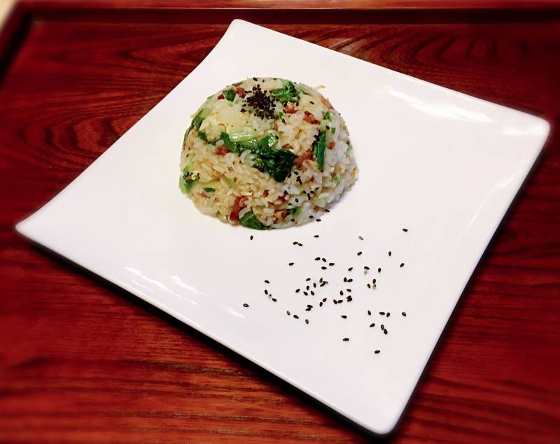 4:放入米饭翻炒均匀,米饭松散略干时,再下青菜炒熟。