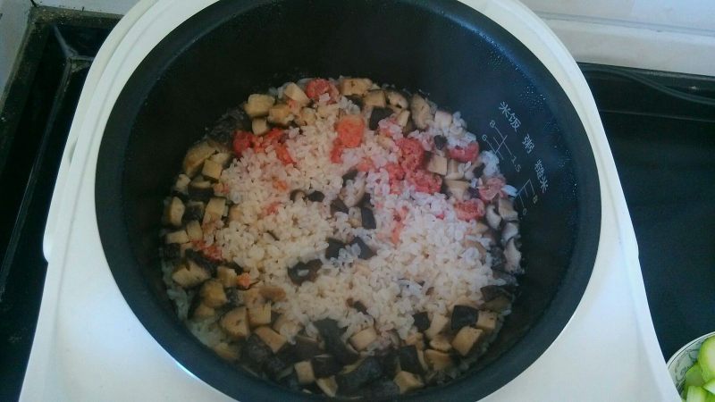 2:将米洗净,用泡发香菇的水加入铁釜内胆,用香菇水来煮饭,饭会更香,将炒好后的香菇粒和腊肠一起倒入铁釜内,盖上盖子,选择精煮米饭,口感选择香软,米种选择长粒米!