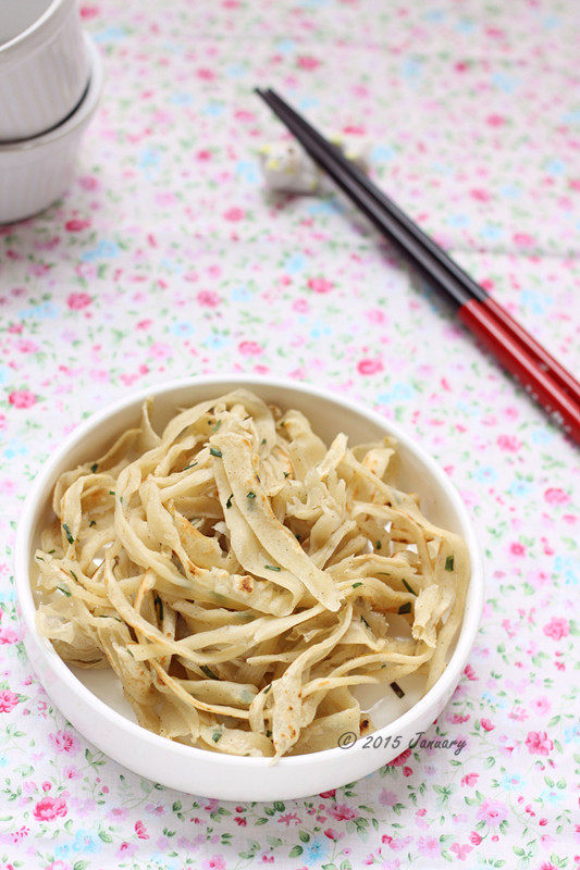 10:用刀将面皮切成条,两边不可切断。然后将面卷起。