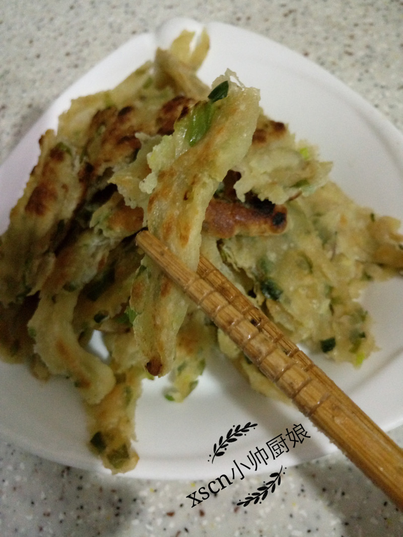 11:将饼放入平底锅用中小火煎,煎好一面,再翻过来煎,煎至两面金黄,用筷子将饼挑松;
