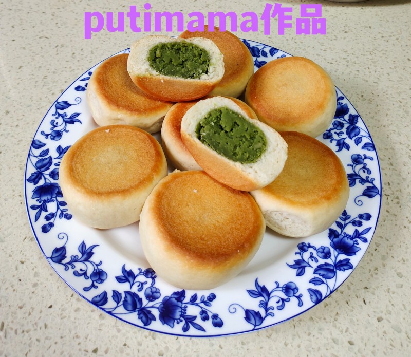 10:包入绿豆馅(每个35克),把包好的绿豆饼收口向上,压扁