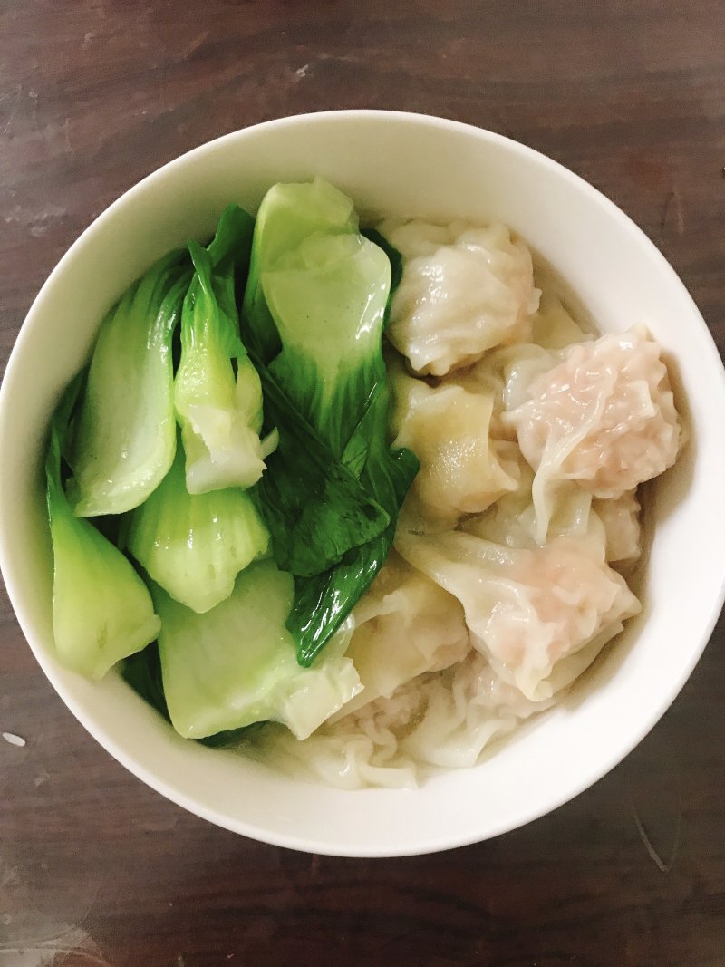 4:锅里放水烧开后把云吞放进煮再加一点清菜,煮熟了捞起放在盛碗中。