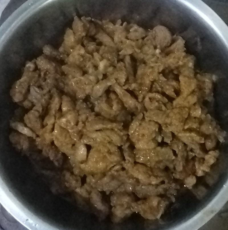 2:里脊肉切丝,加入鸡蛋,烧烤粉,生抽,黑椒汁,搅拌。