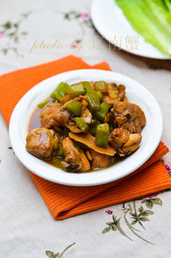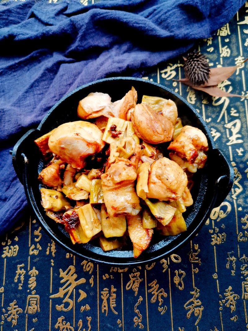 8:把青笋用清水冲洗干净。鸡肉将好时,将青笋下锅翻拌均匀,稍焖即可出锅。这里可以再次调味儿。