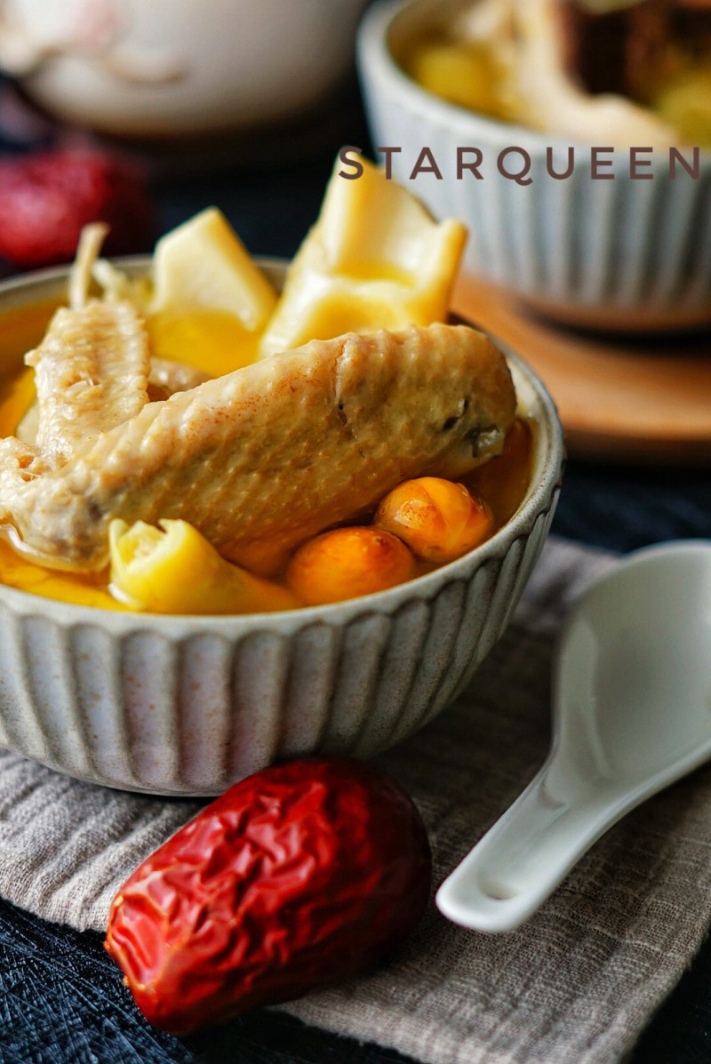 11:当鸡肉已经炖煮一个小时后,将春笋放入,放一些小葱,再放5勺盐(盐量自己掌握)。继续炖煮1个小时,出锅。