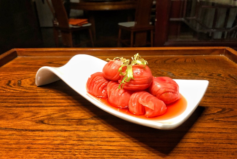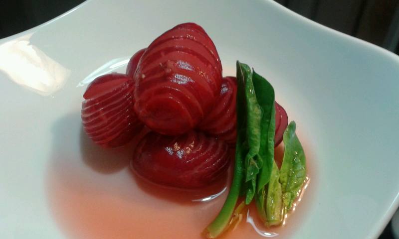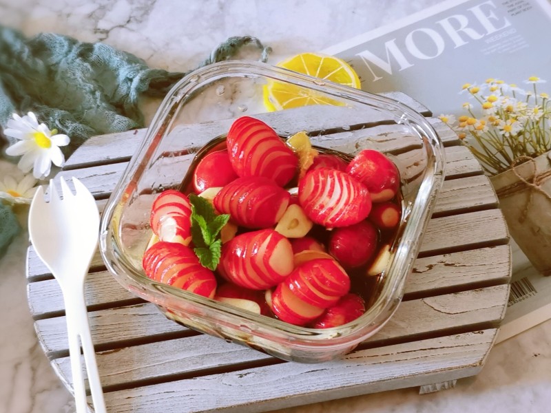 6:将萝卜泡入糖醋汁,不时翻拌几下,腌制15分钟可食用;腌得时间越长,皮中的红色素越能渗透出来,萝卜白肉也能被染成粉红色;如能吃辣,可放两个切碎的小米辣同腌,酸甜微咸带点辣,冷藏后食用,更加脆爽开胃。