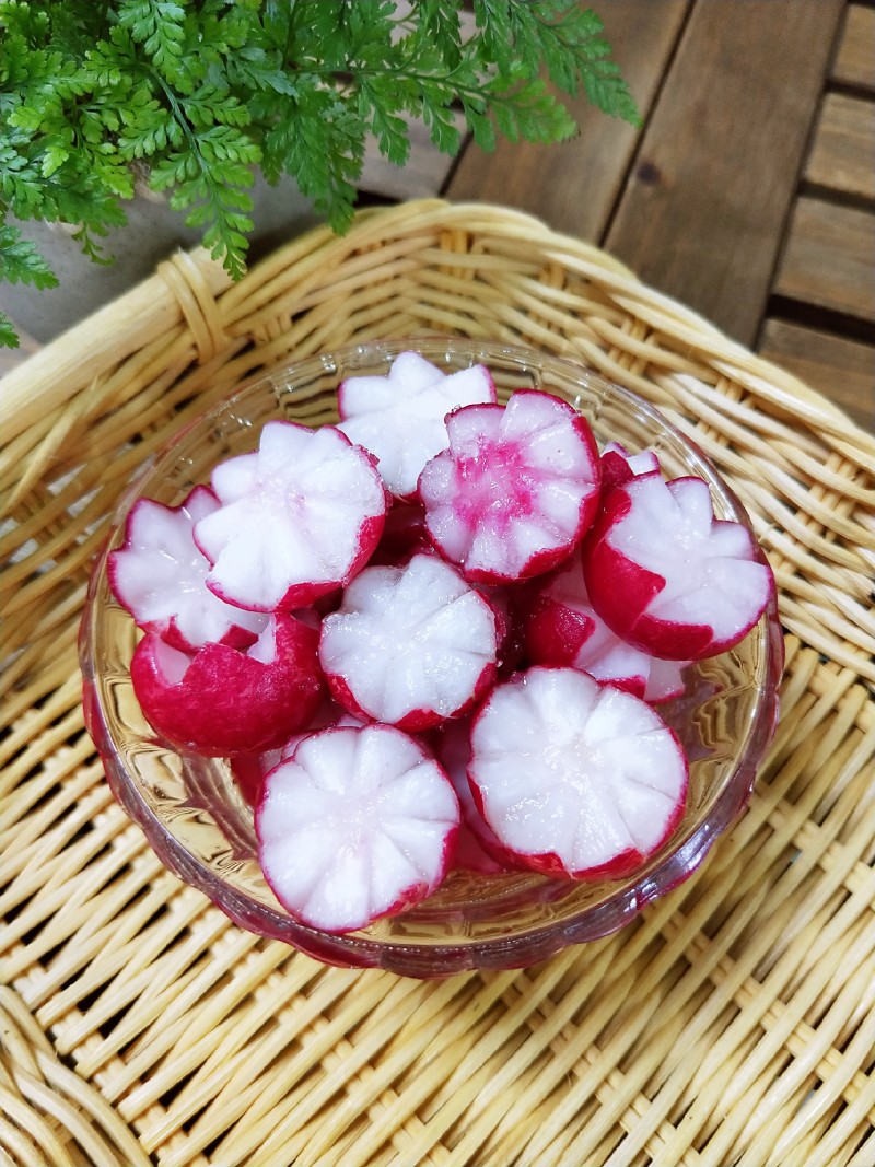 6:或者切完片以后转九十度竖着再切一遍,成为十字交叉状,就是个小萝卜花了。