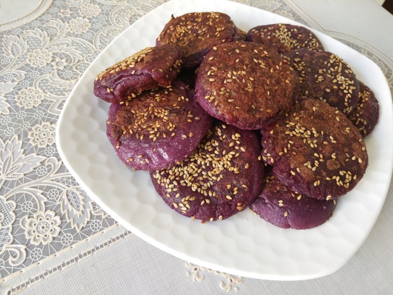 4:把面团分成若干分,做成饼,表面粘上芝麻,我的芝麻本来就是熟的
