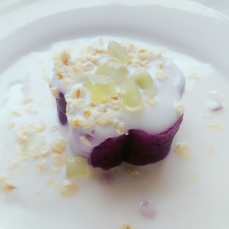 2:紫薯是之前蒸好的,所以只需要去皮弄成紫薯泥就好了