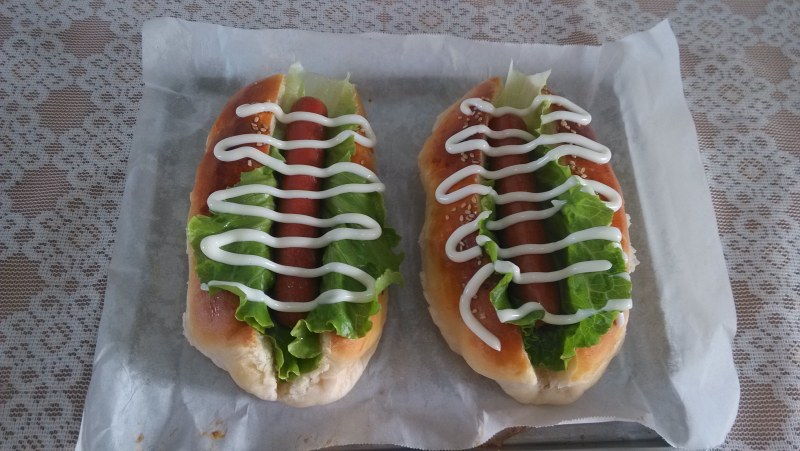 10:放上一根烤过或煎过的火腿肠,表面挤上沙拉酱,热狗面包就做好了。