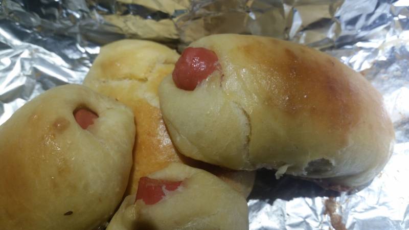 14:夹脆皮肠,压到底部。放进烤箱,盖烤箱门,常温发酵30分钟。如果觉得面包坯涨得不理想,可以延长二次发酵时间。