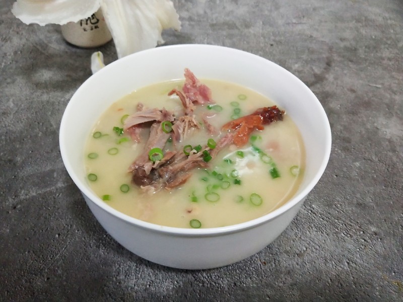 2:将双米混合物淘洗后加入提前调好的鸭架汤浸泡约半小时