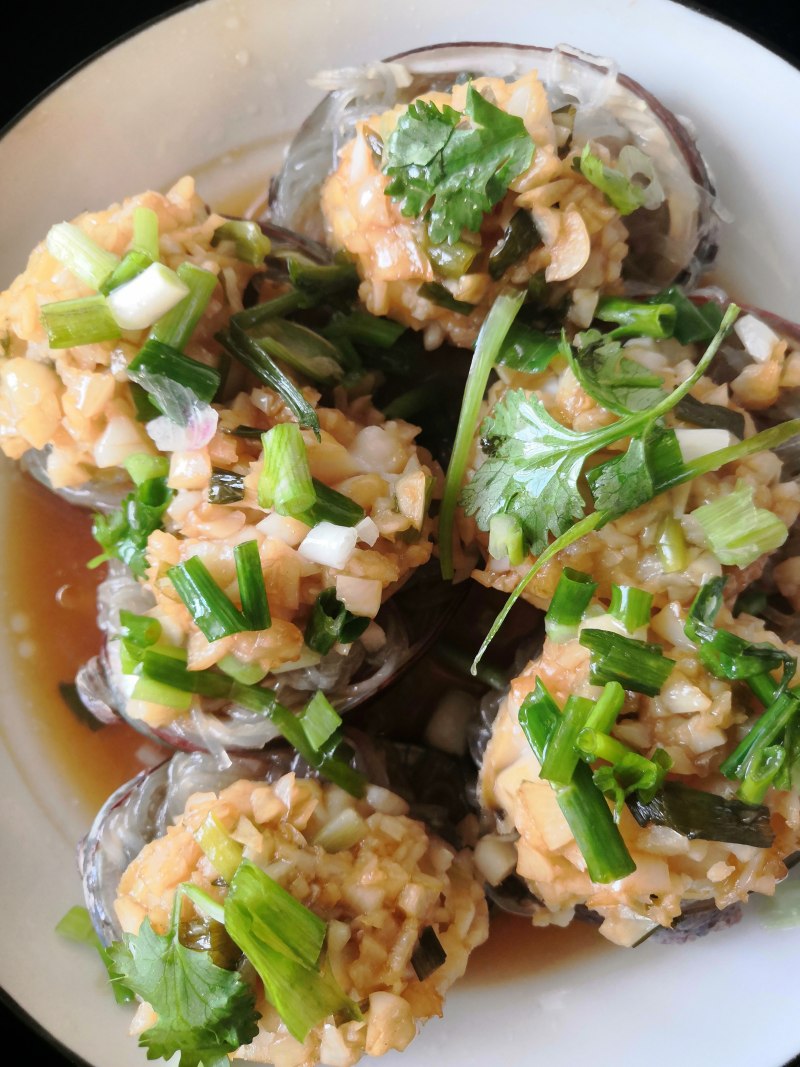 5:鲍鱼壳从清水里拿出来,甩干。把一小段的粉丝都转成圈,摆在鲍鱼壳里。